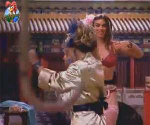 A modelo deu um belo sorriso e as duas dançaram juntinhas por alguns segundos.